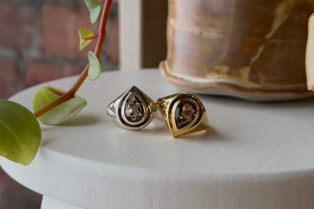 As a designer, I envisioned the Signet Collection to be unique and geometric designs, featuring a captivating gemstone. This one-of-a-kind collection is not your average piece, perfect for those who crave a cool and distinctive look.